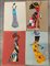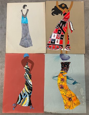 Cartella contenente quattro tecniche miste su cartoncino raffiguranti modelle in abbiglamento degli anni '70 (difetti)