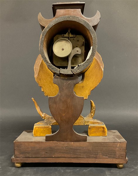 Pendola in legno sorretta da un'aquila dorata, quadrante argentato a numeri romani e decoro guilloché. Movimento a due treni con suoneria delle ore. Austria, 1830-1835 circa (cm 29x40x11)