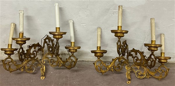 Coppia di appliques a quattro fiamme in metallo dorato, decorate a volute a motivi vegetali e traforate (cm 55x60) (difetti)