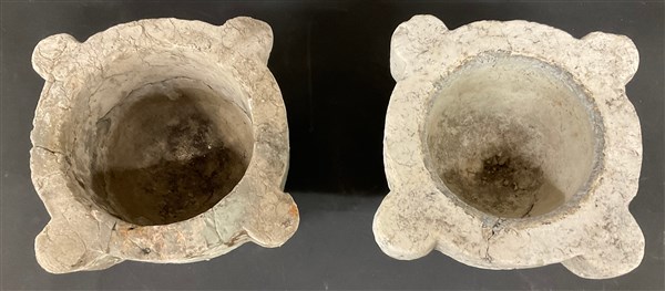 Lot 2186 | Lotto di due mortai a quattro anse in pietra ( h max cm 19) (difetti e restauri