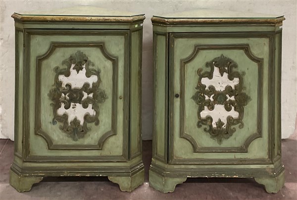 Coppia di antiche angoliere in legno laccato verde con sportello centrato da volute traforate su fondo a specchio. Piedi a mensola e piano dipinto a finto marmo non coevo (cm74x91x44) (difetti e restauri)