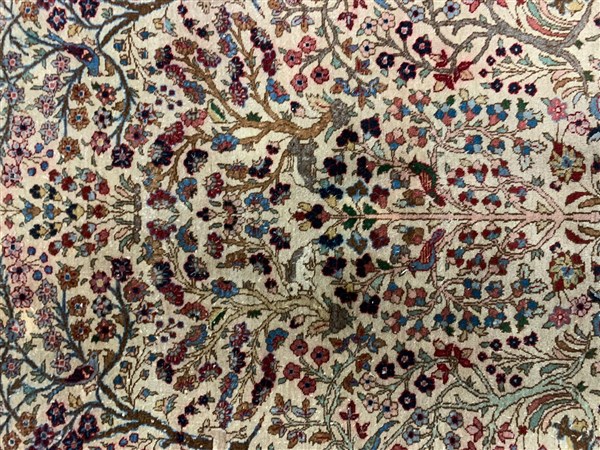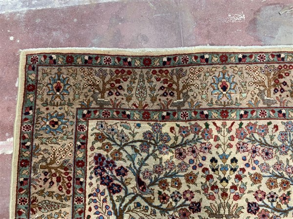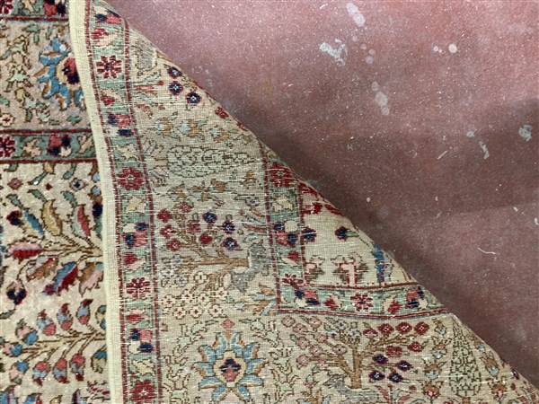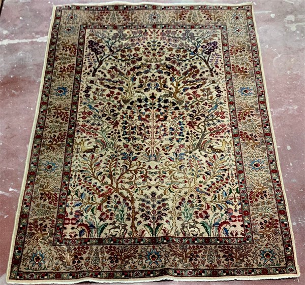 Tappeto Tabriz, Persia, secolo XX. Decoro a preghiera con motivo millefleurs ed animali su fondo bianco (cm 248x176) (lievi difetti)