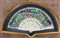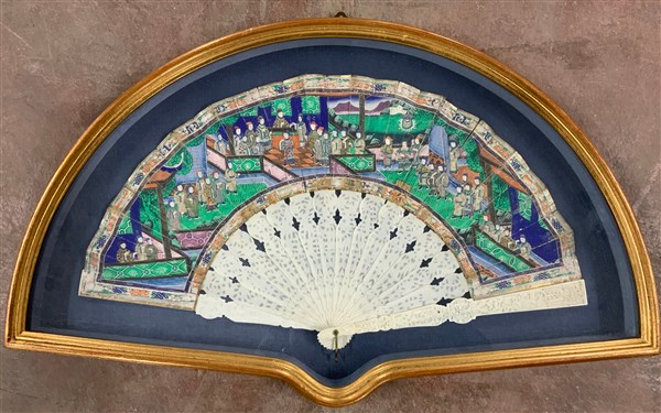 Ventaglio con stecche traforate e incise, pagina in carta dipinta con scene di vita di corte, in teca, Cina sec. XIX (misura max. cm 60) (difetti)