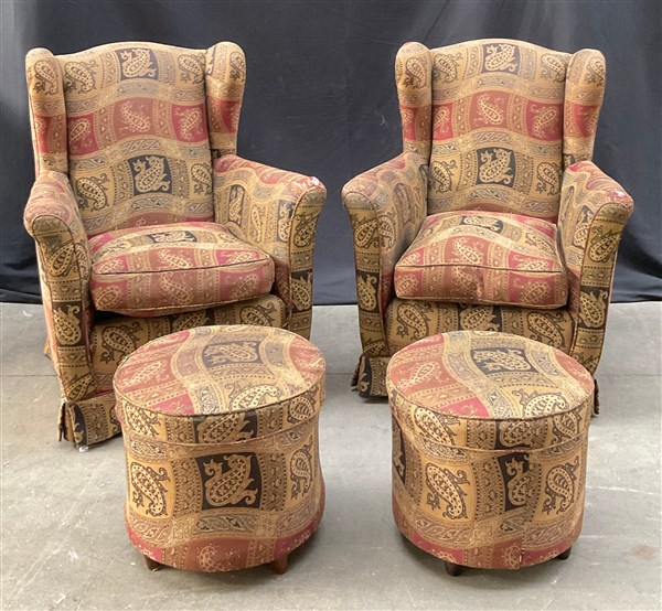 Lotto composto da una coppia di bergères e due pouf tondi, rivestimenti in tessuto Etro (difetti)