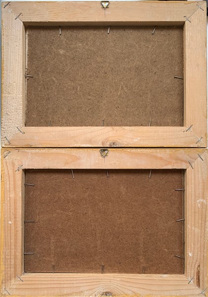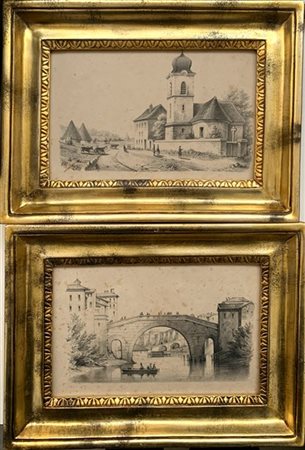 Coppia di incisioni raffiguranti paesaggi (cm 13x20) in cornici dorate (difetti)