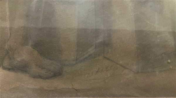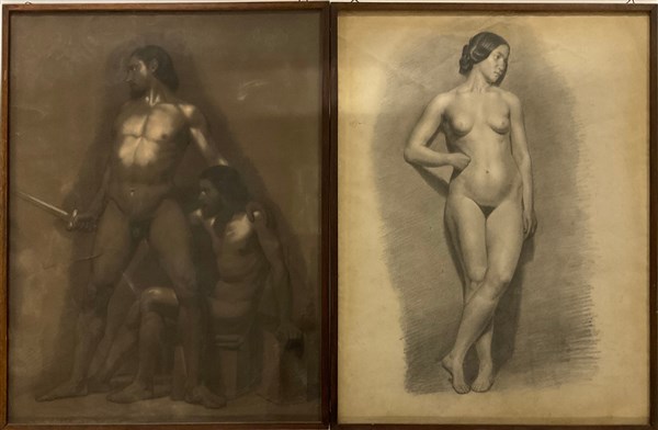 Scuola del secolo XIX "Nudo femminile" e "Nudi virili" due disegni a carboncino, sfumino e gessetto bianco su carta (cm 57x42,5 circa). Sul secondo tracce di firma in basso. In cornici