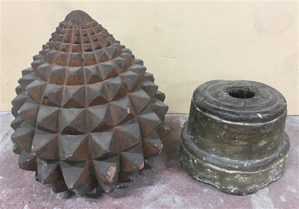 Lotto composto da un elemento decorativo in terracotta a forma di pigna e un an