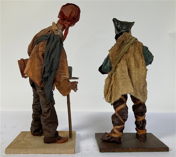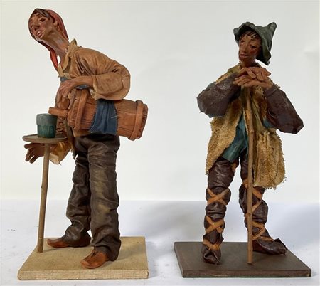 Due figure da presepe in terracotta e cartapesta, firmate (h. max cm 30,5) (difetti)