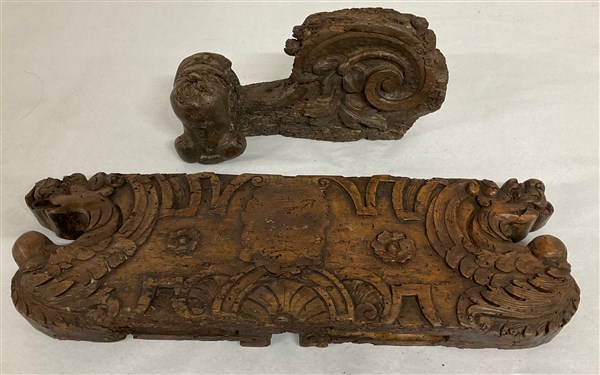 Lotto di due antichi fregi in legno intagliato (l max cm 52) (difetti)