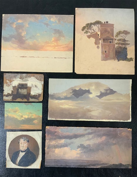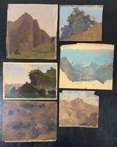 (Attribuito) Cartelletta contenente tredici bozzetti ad olio su carta e cartoncino, soggeti e misure diverse