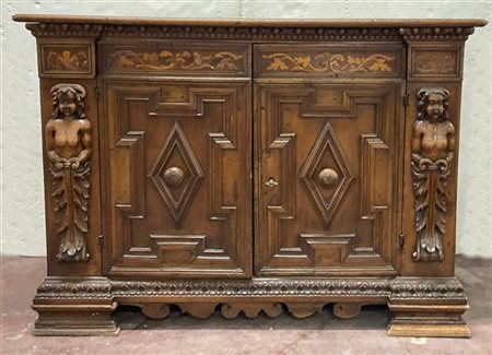 Credenza a due sportelli pannellati con figure femminili laterali scolpite, pie