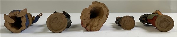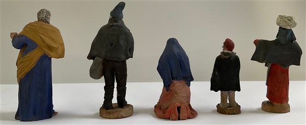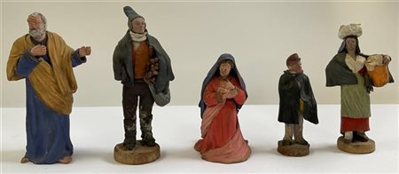 Ignoto plastificatore attivo in Sicilia entro il primo trentennio del secolo XX. "Madonna in adorazione del divino infante", "San Giuseppe", "Uomo che reca un fascio di legna", "Vecchio con mantello", "Donna che reca un cesto di panni". Lotto composto da cinque figure da presepe in terracotta policroma (h. max cm 20) (difetti e mancanze)