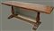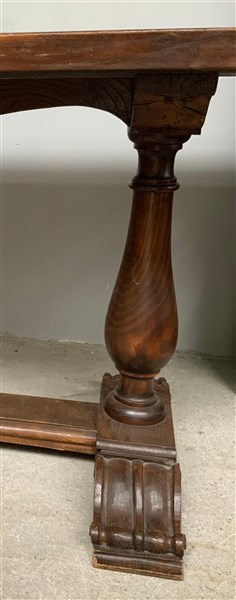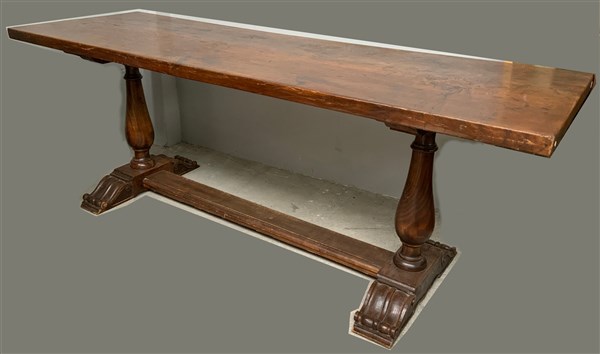 Tavolo rettangolare con sostegno e colonne tornite poggianti su piedi a mensola riunite da traversa (cm 213x78x68) (difetti)