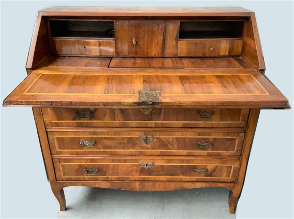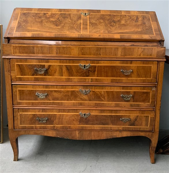 Ribalta lastronata e filettata in legni vari a tre cassetti sotto piano, calatoia celnate vani, cassettini e segreti, gambe rastremate (cm 103x107x51) (difetti)