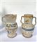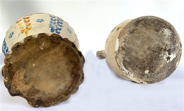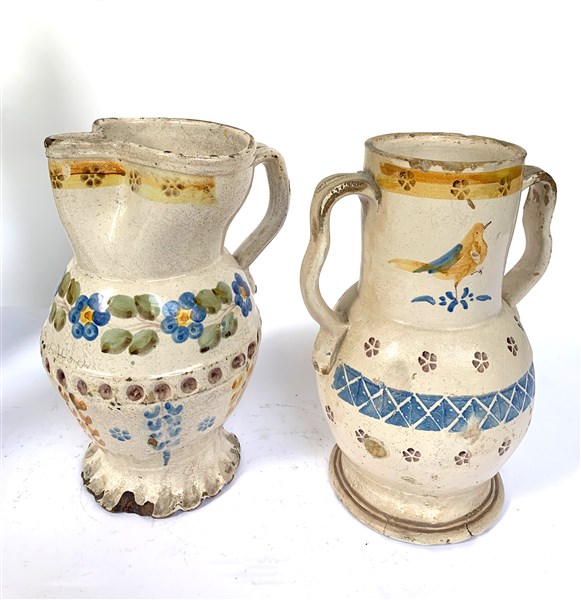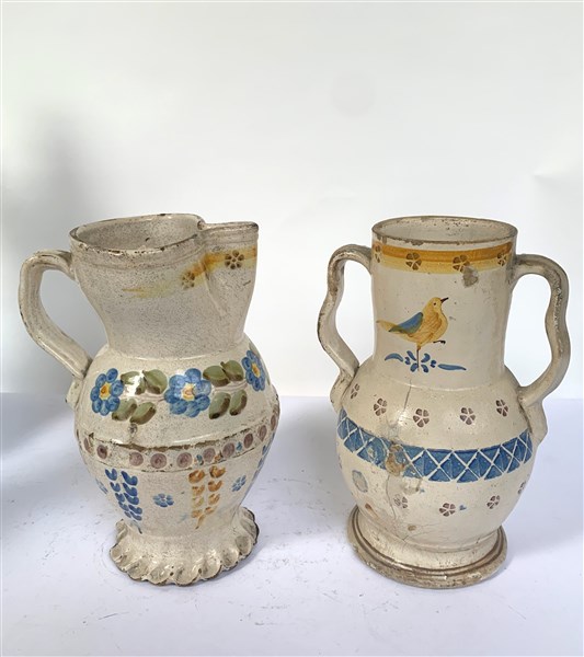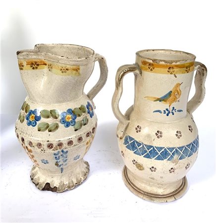 manifattura dell'Italia meridionale del secolo XIX, lotto composto da una brocca trilobata in terracotta dipinta a fiori (h cm 32) ed un vaso biansato in terraglia decorato a volatili (h cm 32) (difetti e restauri)