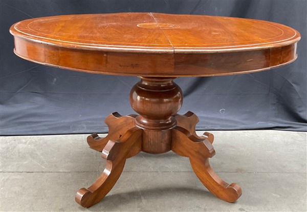Tavolo allungabile con piano ovale filettato, gamba centrale tornita a balaustr