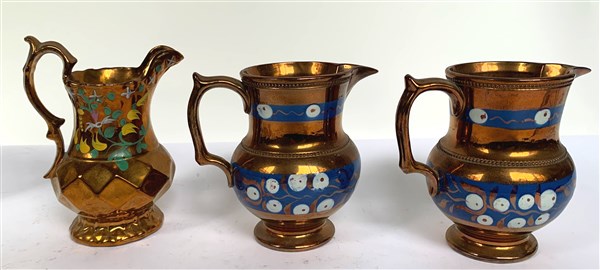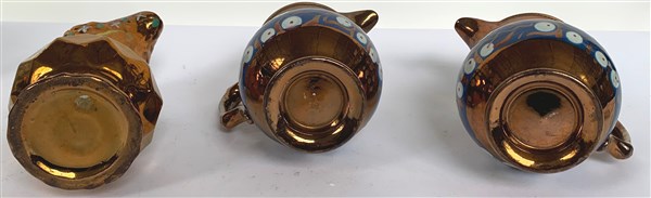 Manifattura fine secolo XIX Lotto composto da tre brocche in ceramica decorata a color finto bronzo e in policromia (h max cm 18) (difetti)