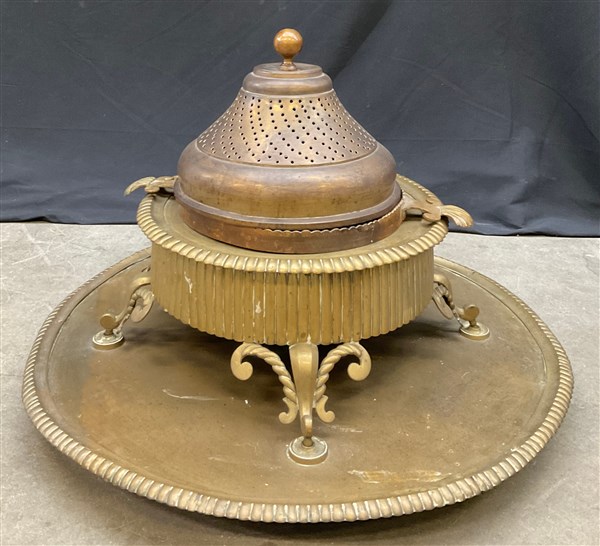 Braciere in ottone su base circolare con sostegni a volute e fasce scanalate (d