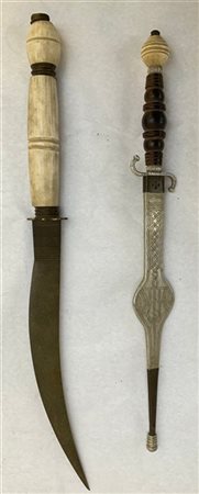 Lotto di due pugnali cerimoniali marorcchini con impugnature in legno e osso. Il primo con lama curva, interessante la lama in damasco , Persia del nord.