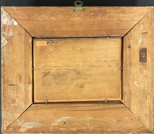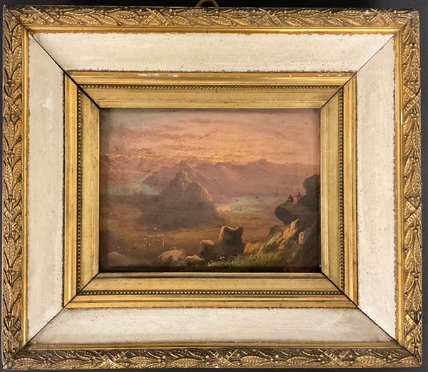 "Lago svizzero" olio su tavola (cm 14x19) Firmato in basso a destra. AL retro: iscrizione e cartiglio. In cornice (difetti)