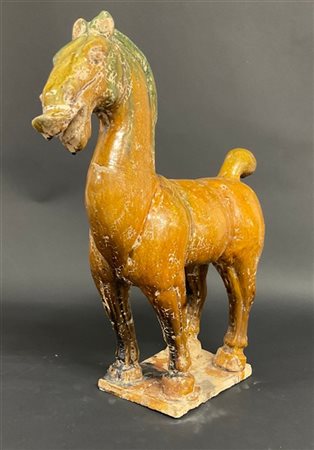 Scultura in terracotta policroma raffigurante un cavallo in stile Thang (h cm 45) (difetti)