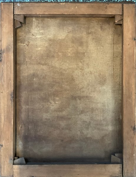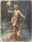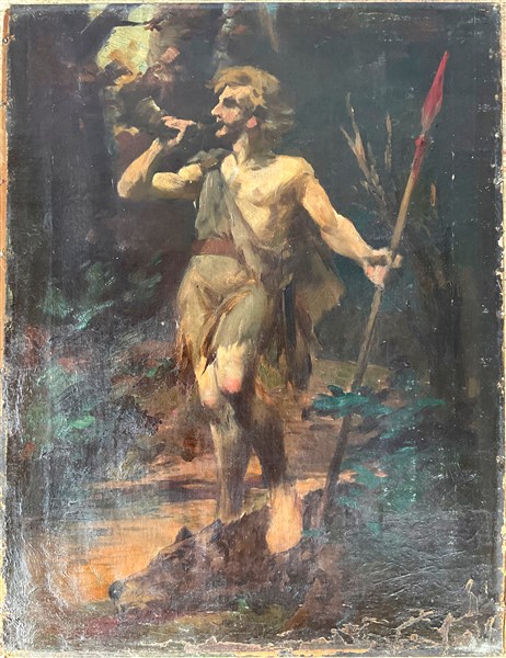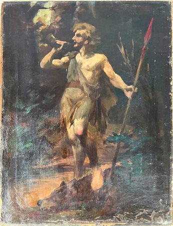 Scuola del secolo XIX "Cacciatore con orso" olio su tela (cm 53x40) (difetti)