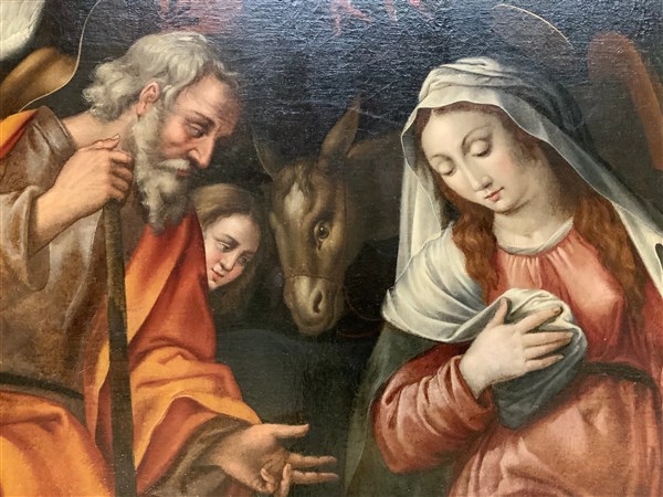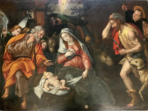 Scuola del nord Europa dell'inizio del secolo XVII "Adorazione dei pastori" olio su tela (cm 121x160)