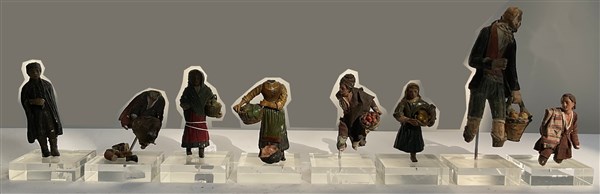Lotto composto da otto figure da presepe in terracotta policroma di diversa manifattura, su basi in plexiglass (h. max cm 16) (difetti e mancanze)