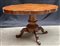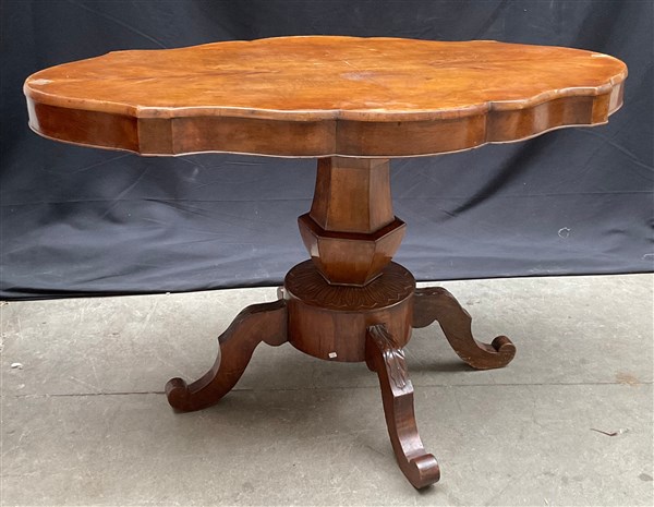 Tavolo a biscotto in legno con sostegno centrale esagonale base tonda con piedi sagomati intagliati a motivi vegetali, secolo XIX (cm 130x77x74) (difetti)