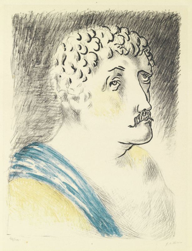 Giorgio de Chirico Volos 1888 - Roma 1978 Hebdomeros, 1929 Litografia a tre colori, es. 44/100, cm. 40,7x30,8 (lastra), cm. 56,5x45,4 (carta) Firma a matita sul margine in basso a destra: G. de Chirico, timbro a secco: Libreria Prandi Reggio E., tiratura in basso a sinistra: 44/100. Da Metamorphosis, suite di sei litografie raccolte in cartella, Editions des Quatre Chemins, Parigi; tiratura di 100 esemplari a colori firmati e numerati da 1/100 a 100/100; 10 esemplari in nero firmati, aggiunti in origine alle cartelle di testa numerate da 1/10 a 10/10; 12 esemplari fuori commercio in nero e a colori numerati da I a XII e contrassegnati h.c. e 6 prove (una per ogni soggetto) con biffatura, firmate dall'artista. Bibliografia: Antonio Vastano, Giorgio de Chirico. Catalogo dell'opera grafica 1921-1969, Edizioni Bora, Bologna, 1996, p. 59, n. 22.