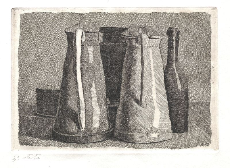 Giorgio Morandi Bologna 1890 - 1964 Natura morta con cinque oggetti, 1956 Acquaforte su rame, cm. 14x19,9 (lastra), cm. 32x44,4 (carta) In basso a sinistra scritta a matita: 3° stato: timbro a secco Eredità Morandi 1996. Storia: Asta dell'eredità di Giorgio Morandi, Milano, Finarte, 12 marzo 1996, lotto n. 181; Collezione privata Terzo stato su quattro, esemplare non firmato e non numerato; tiratura di 15 esemplari numerati I/XV per l'artista e 150 esemplari numerati 1/150 per l'Associazione Amatori d'Arte, Roma. Bibliografia: Lamberto Vitali, L'opera grafica di Giorgio Morandi, Giulio Einaudi Editore, Torino, 1964, n. 116; Michele Cordaro, Morandi incisioni. Catalogo Generale, Edizioni Electa, Milano, 1991, p. 134, n. 1956 1.