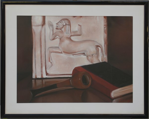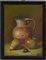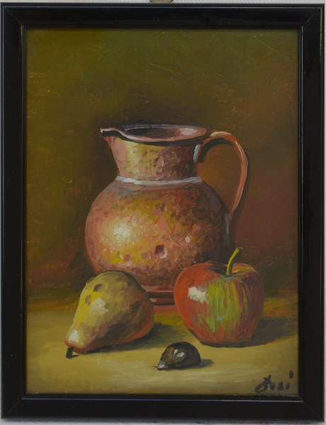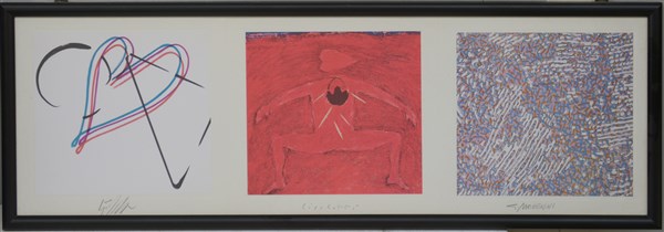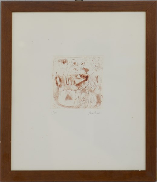 Cartone contenente due piccoli oli, uno su tela e uno su masonite, raffiguranti nature morte di autori e misure diverse; quattro multipli, tre su carta e una su lastra metallica di autori soggetti e misure diverse tra cui Shafik e un opera con tre riproduzioni firmate (cm 19x59)