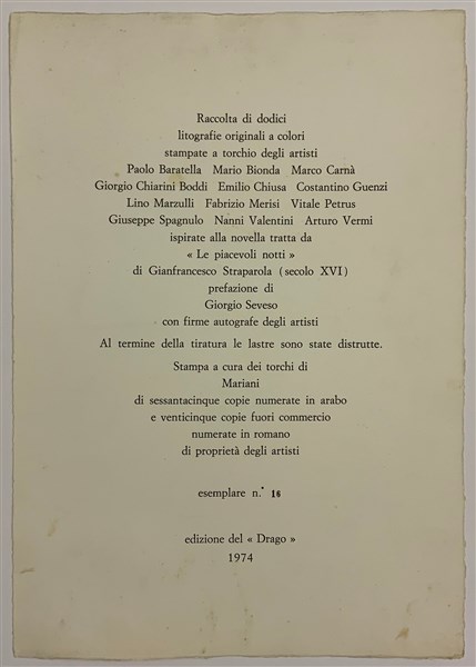 numerate 16/65 e firmate in basso a matita. Ispirate alla novella tratta da "Le piacevoli notti" di Gianfrancesco Straparola. Edizioni del "Drago" 1974 (difetti)