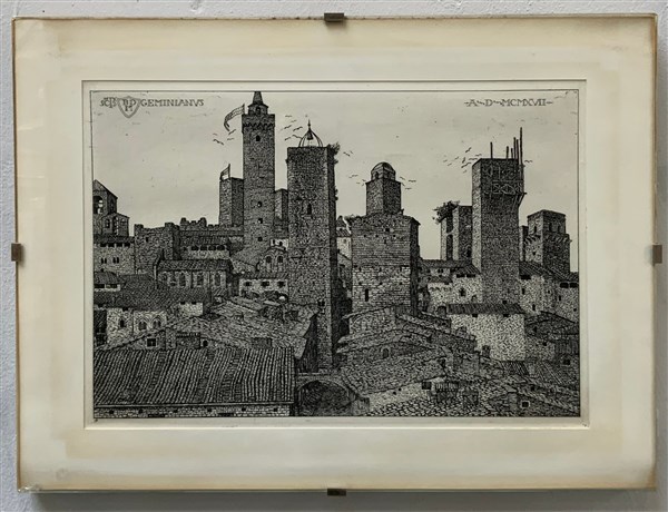 Benvenuto Disertori "Torri di San Gimignano" 1917 acquaforte lastra cm 29x39 sig