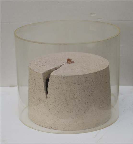 scultura in ceramica dipinta di forma cilindrica in teca di plexiglass