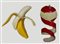 Lotto composto da quattro pannelli in legno dipinto raffiguranti rispettivamente una banana, una mela, dei peperoncini e un uovo all' "occhio di bue"