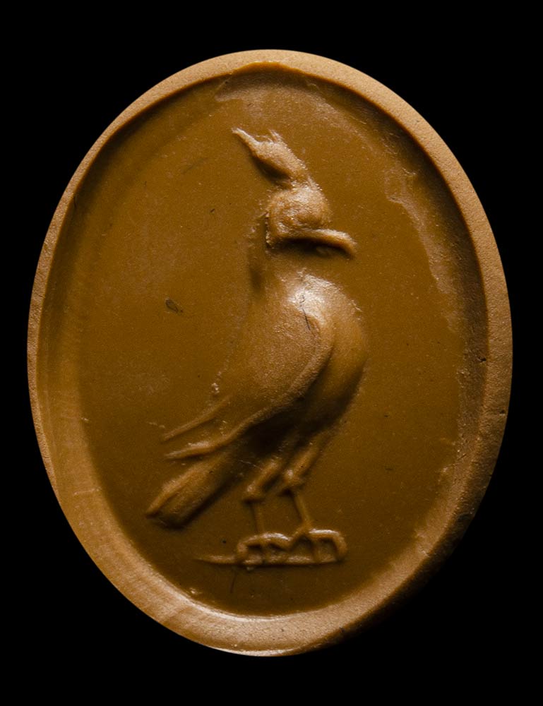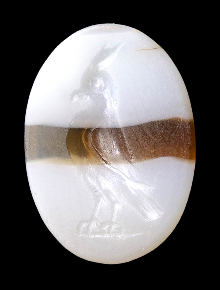 Facing left, his head surmounted with the Egyptian double-crown (?). These characteristics are references to Horus. Groundline.