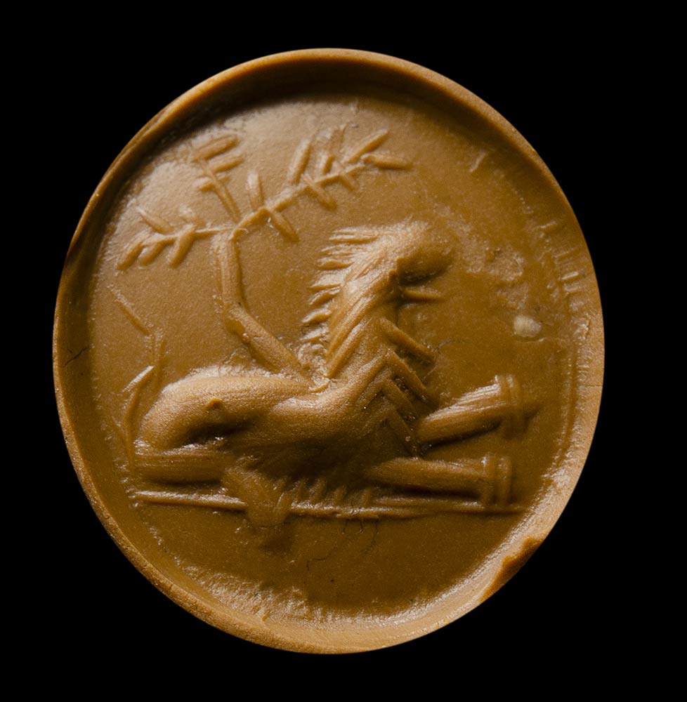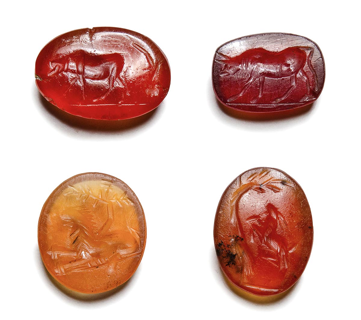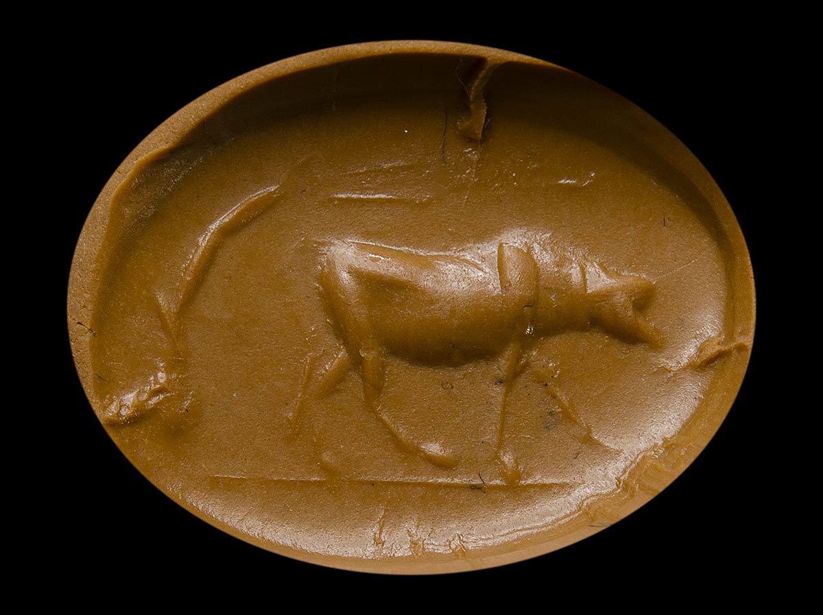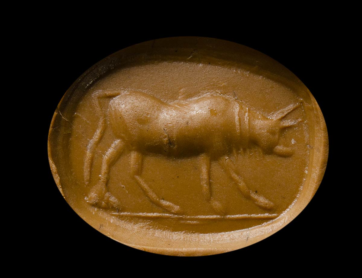 A bull facing left with a tree. Groundline; Bull facing left. Groundline ; Crouched lion facing left, under a palm tree (?); Goat grabbing fruits on a tree. Groundline. Slight wear marks.