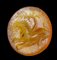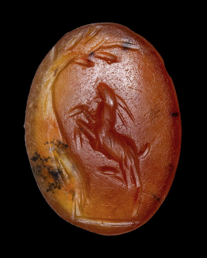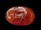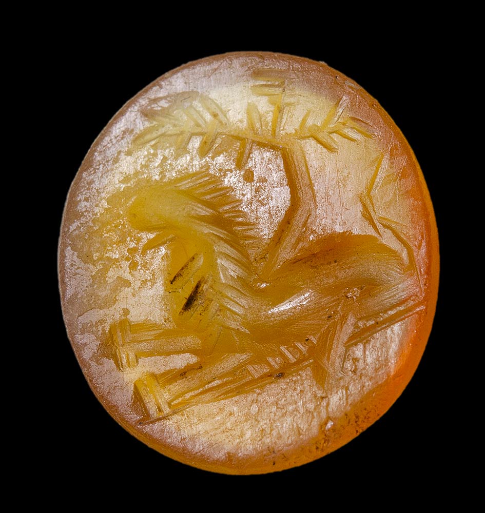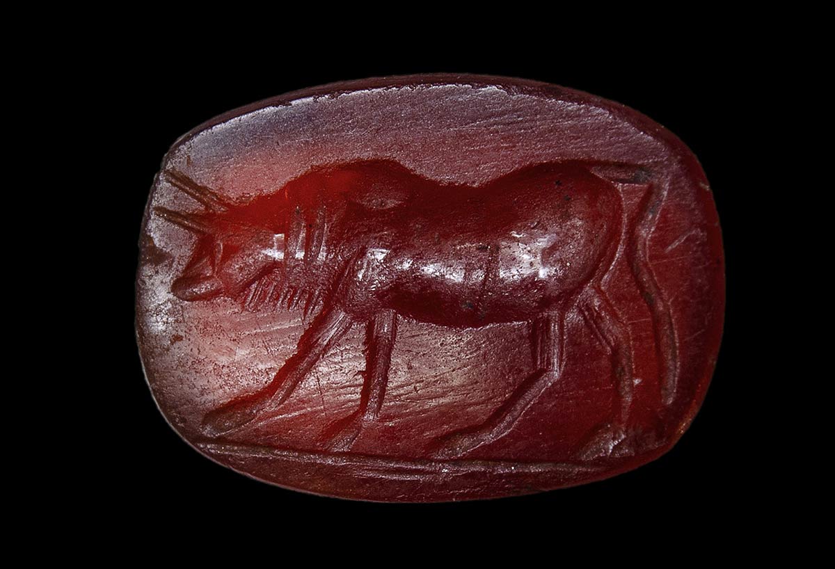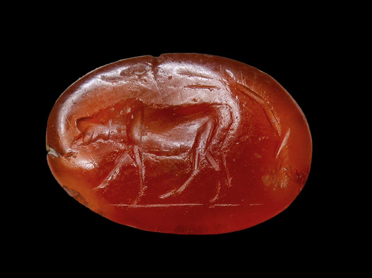 A bull facing left with a tree. Groundline; Bull facing left. Groundline ; Crouched lion facing left, under a palm tree (?); Goat grabbing fruits on a tree. Groundline. Slight wear marks.