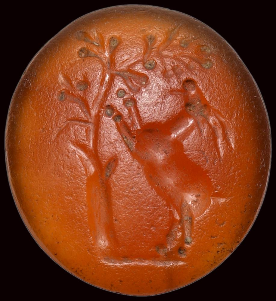 The animal lifts its front legs to lean on a trunk of a tree and eats its leaves. Groundline. Bucolic scene. Use of globular elements. Wear marks.