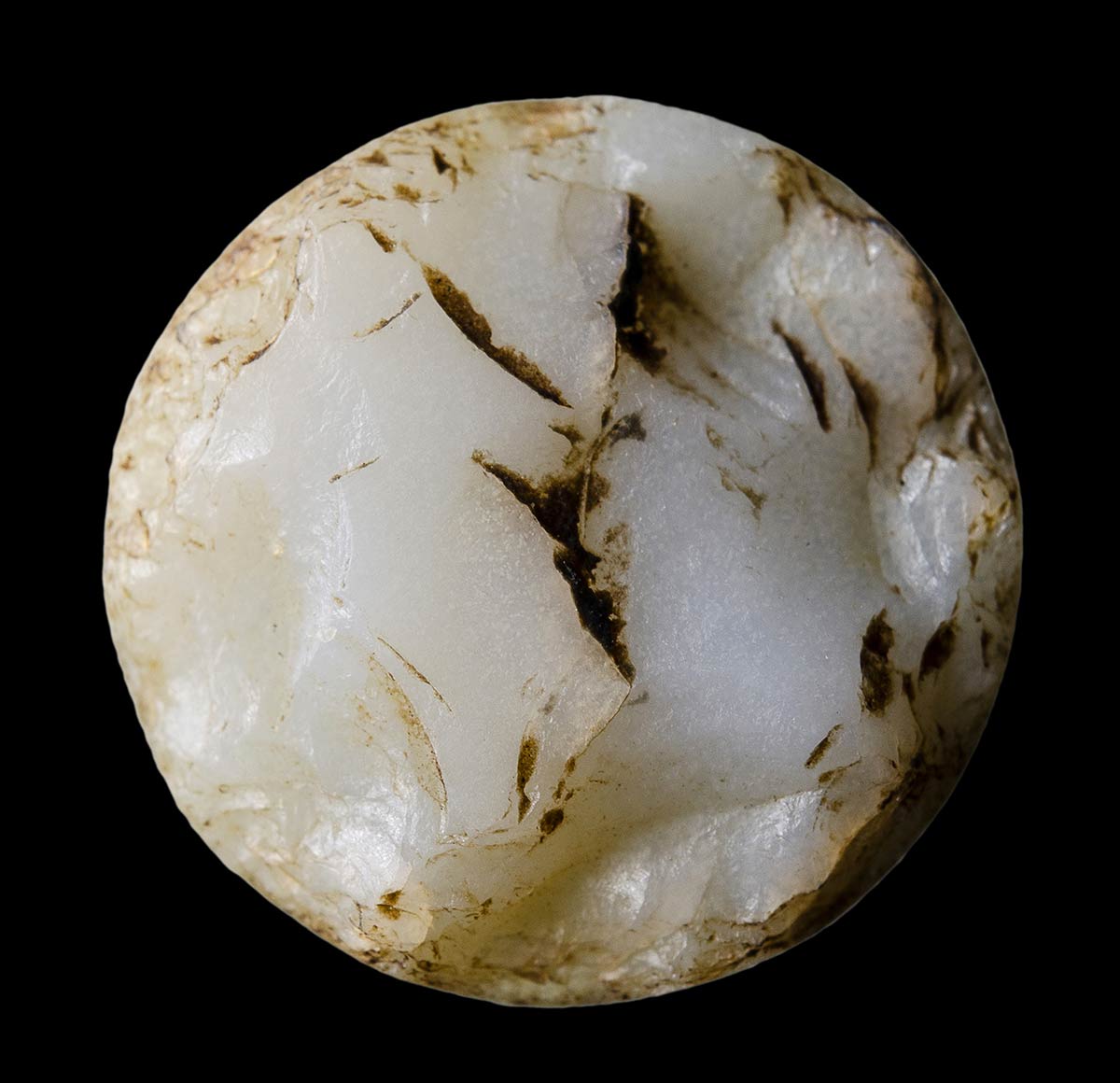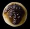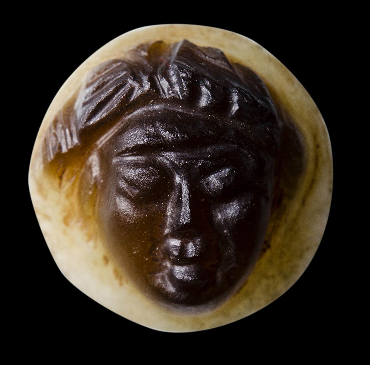 A roman, double-layer agate cameo. Facing head. The effigy (apotropaical mask) has been engraved in the brown higher layer, on a light white field. Wear marks.