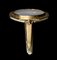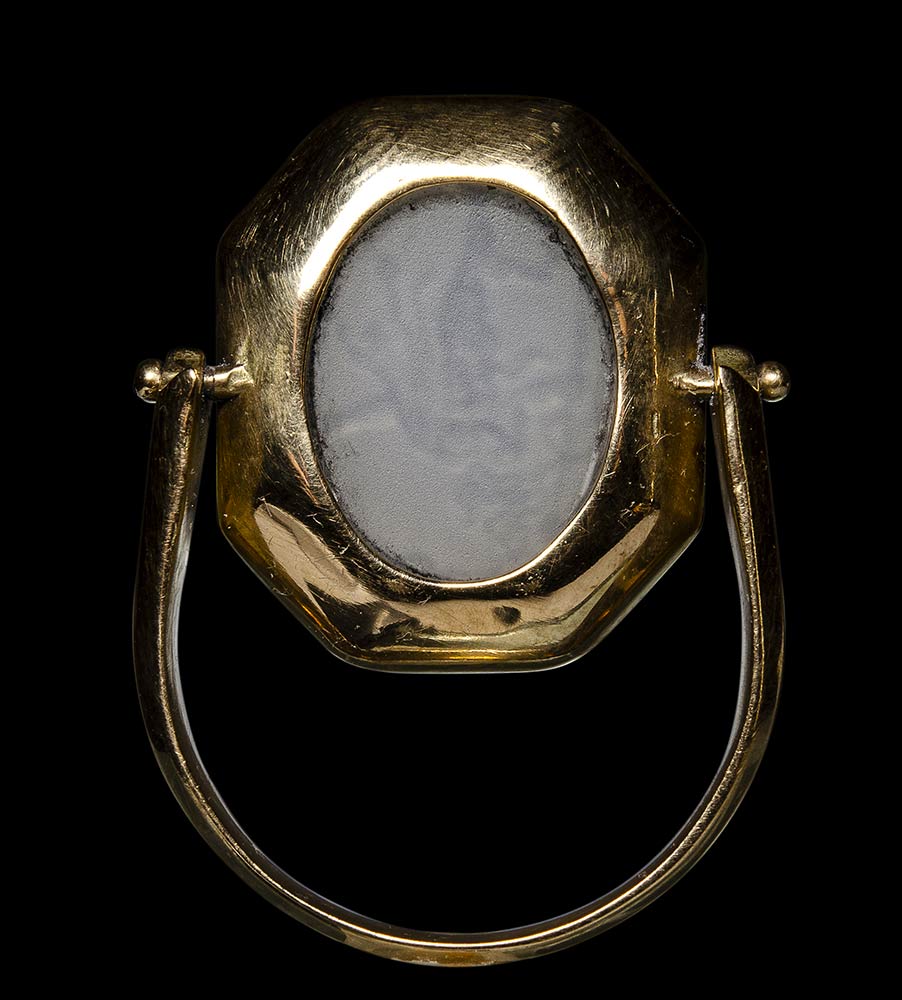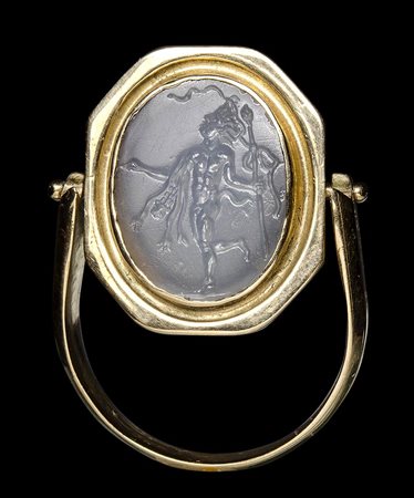 This fine intaglio is certainly inspired by a famous ancient statuary model, magnificently engraved in ancient times on a sardonyx, preserved in Paris, Cabinet des Médailles-BN, inv. 58,1648. Mounted on a gold swivel ring with octogonal bezel, this chalcedony depicts a dancing satyr in the same pose, holding the thyrsus with his left hand and holding a lion (or panther) skin with his right one. The left foot is elegantly lifted backwards with a dancing step. The anatomical details of the face and of the body, with the use of globular elements (eye, etc), are referable to the late roman republican glyptic production. Beautiful shades and color of the stone. Wear marks.