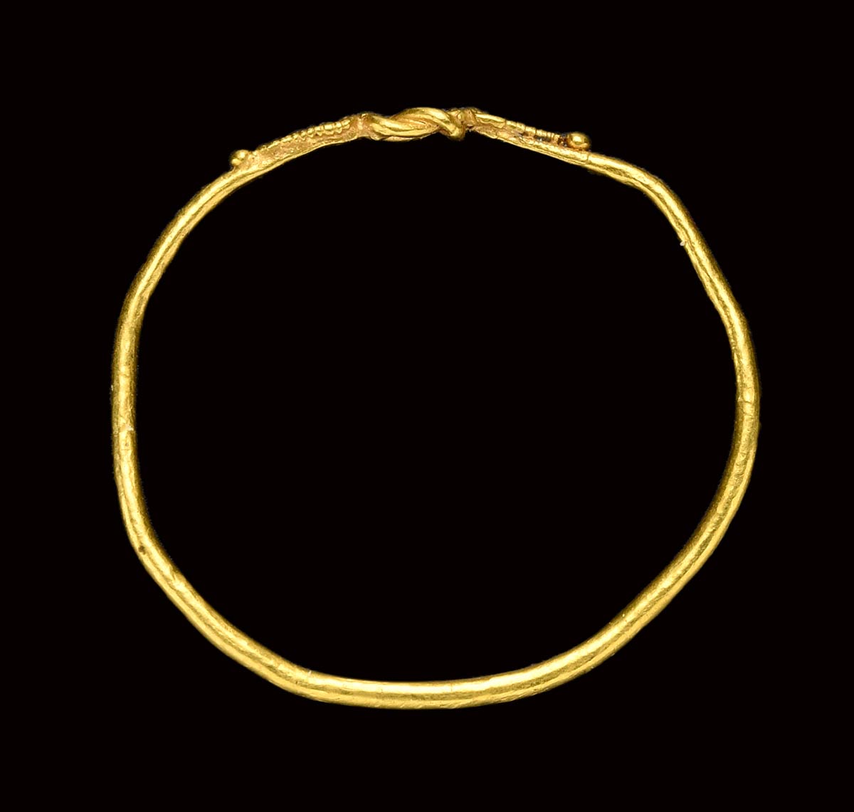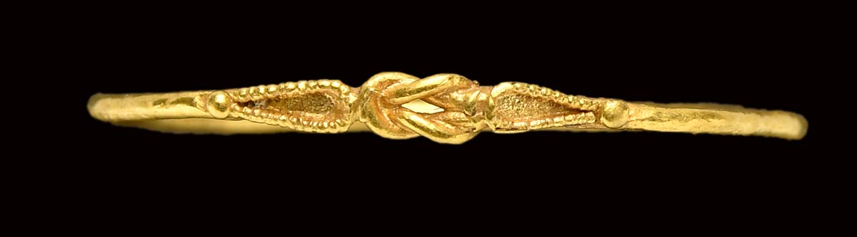 The refined work is characterized by a small knot of Hercules flanked on both sides by two hollow drop decorations, ending with a spherical element. Very thin rod. Excellent state of preservation. Magna Grecia.