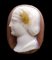 Facing left, her hair inside a sakkos adorned with three ivy leaves colored with the last layer of the stone; beneath, three curls of hair framed the outter corner of the eye until her jaw. The features reminds the classical greek period; straight nose, almond-shape lidded eye, small semi-opened lips and rounded chin. Her neck is partially covered by the folds of a drapery.