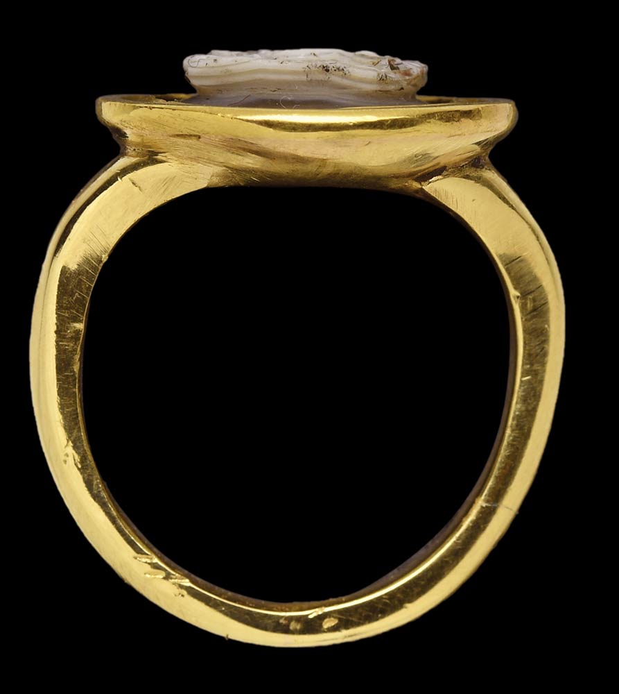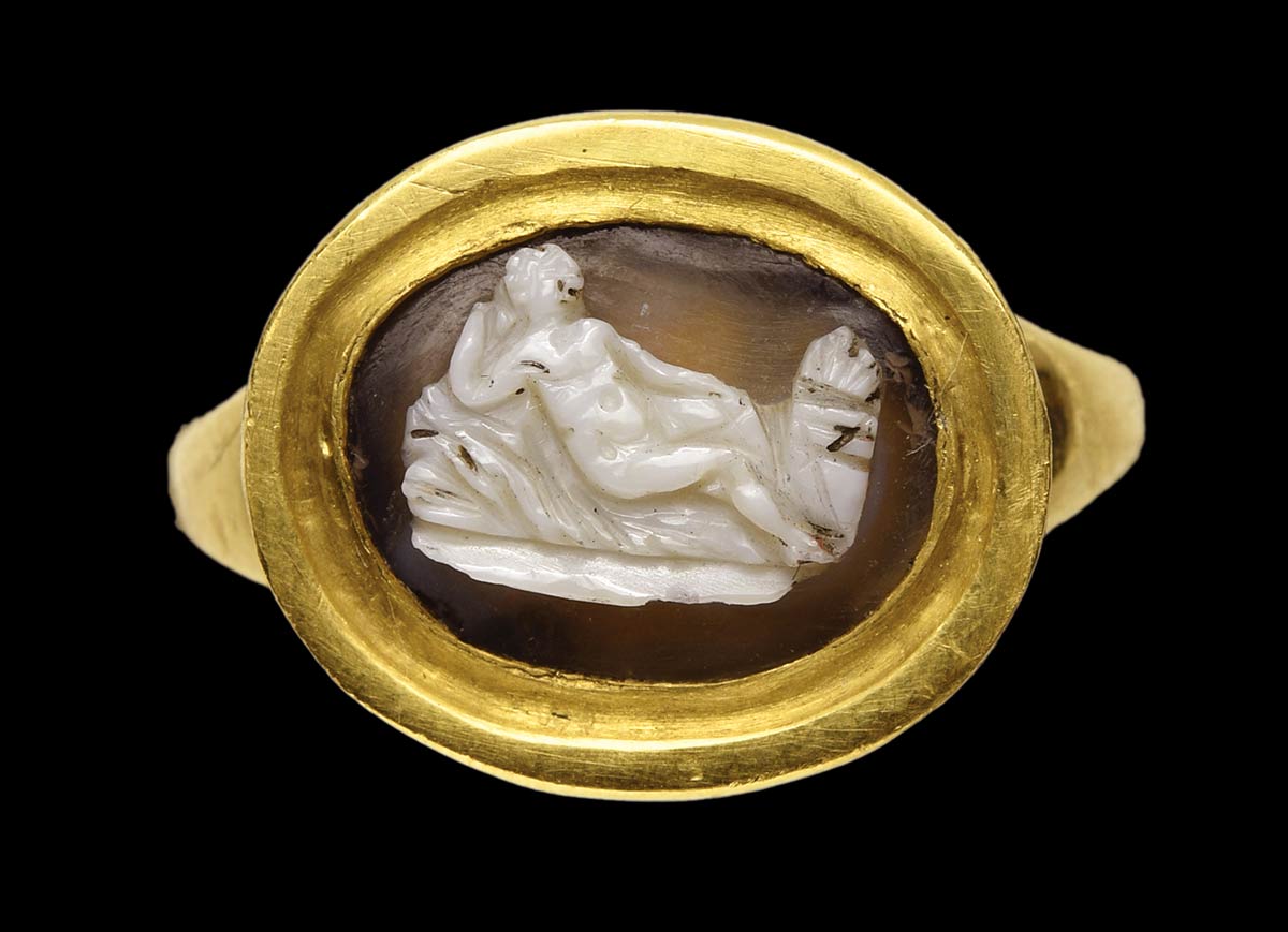 A renaissance agate cameo mounted in a modern gold ring. Reclining Venus.