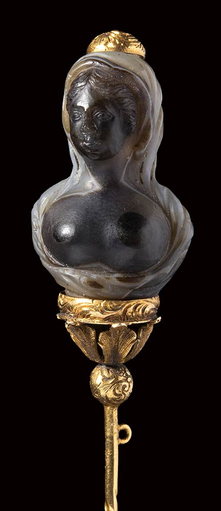 The figure is characterized by a veiled head, partially draped torso with large exposed breasts. The bust is finely sculpted, emphasizing in the best way the beauty of this banded agate, engraving the body in the dark part and the drapery in the light part of the stone. The nose is damaged. This microsculpture is set in an elegant mounting adorned with plant motif, finely chiseled.