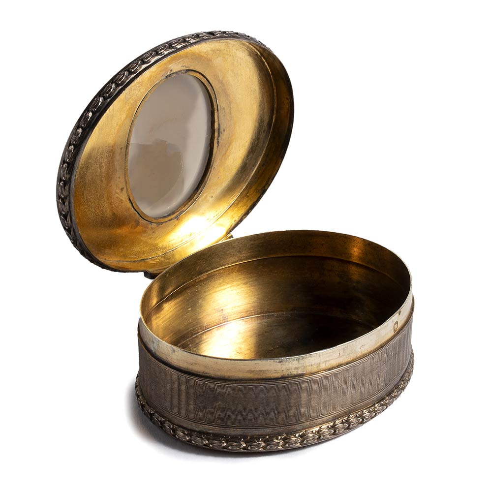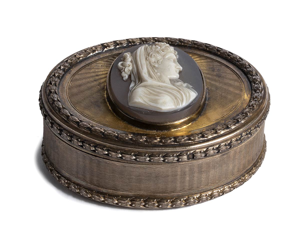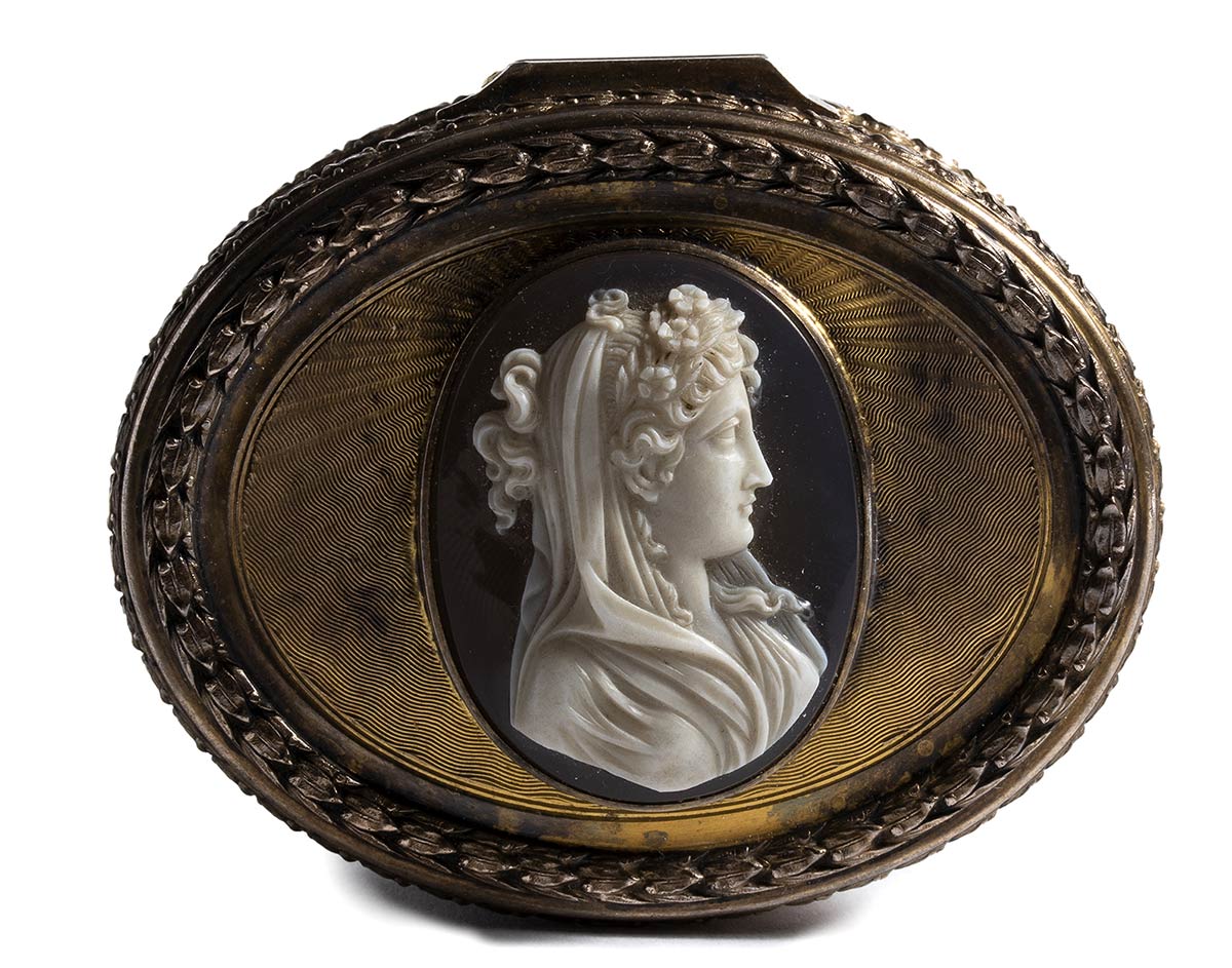 A large two-layered agate cameo set in a Victorian gilded massive silver sauf box. Veiled bust of Flora.