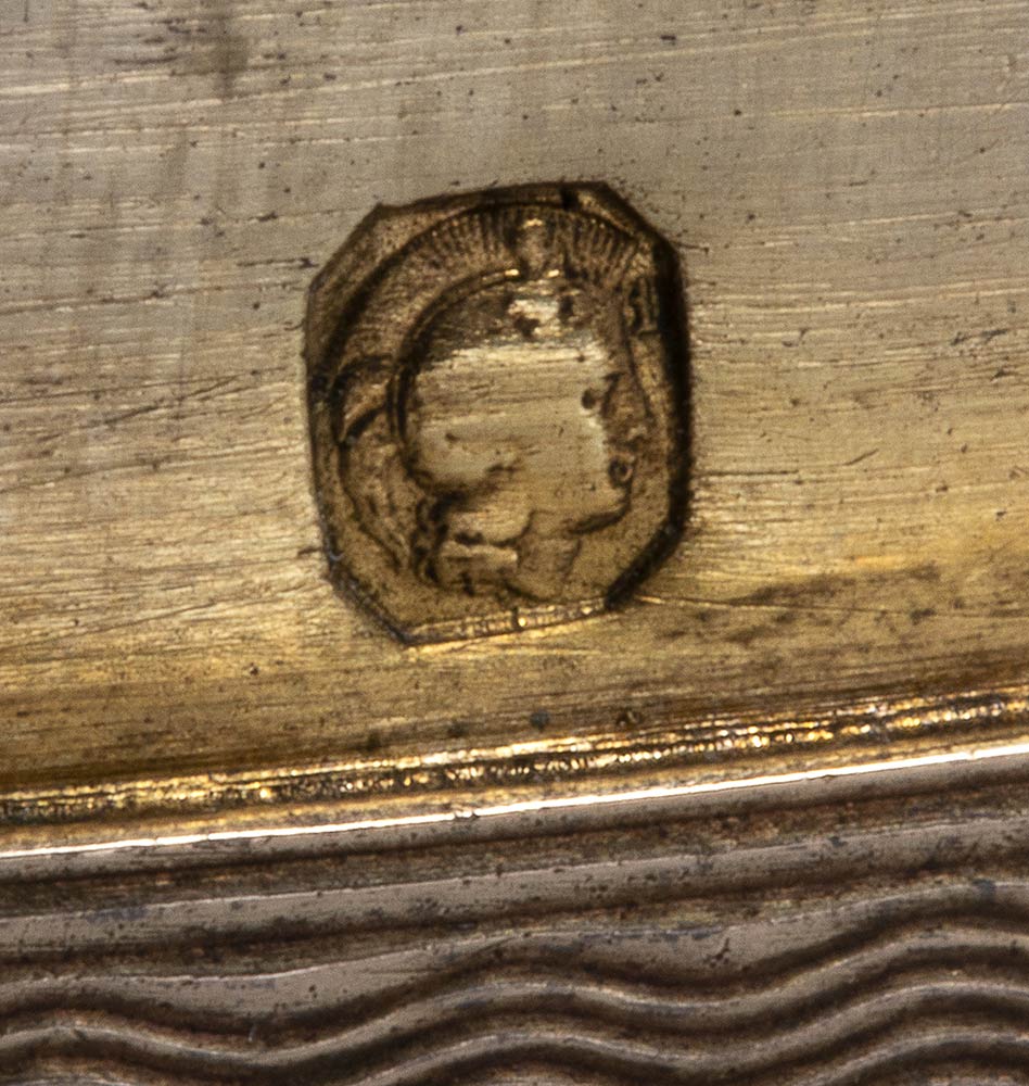 The female bust is turned to the right side. The figure is characterized by thick hair adorned with a flowers wreath. The head is veiled and the bust is draped. The stone is set in a fine boxe finely engraved, adorned with a garland frame on the edge. Very fine condition. Octagonal mark: Helmeted head of Minerva (1st title), facing right. French manufacture since 1838.