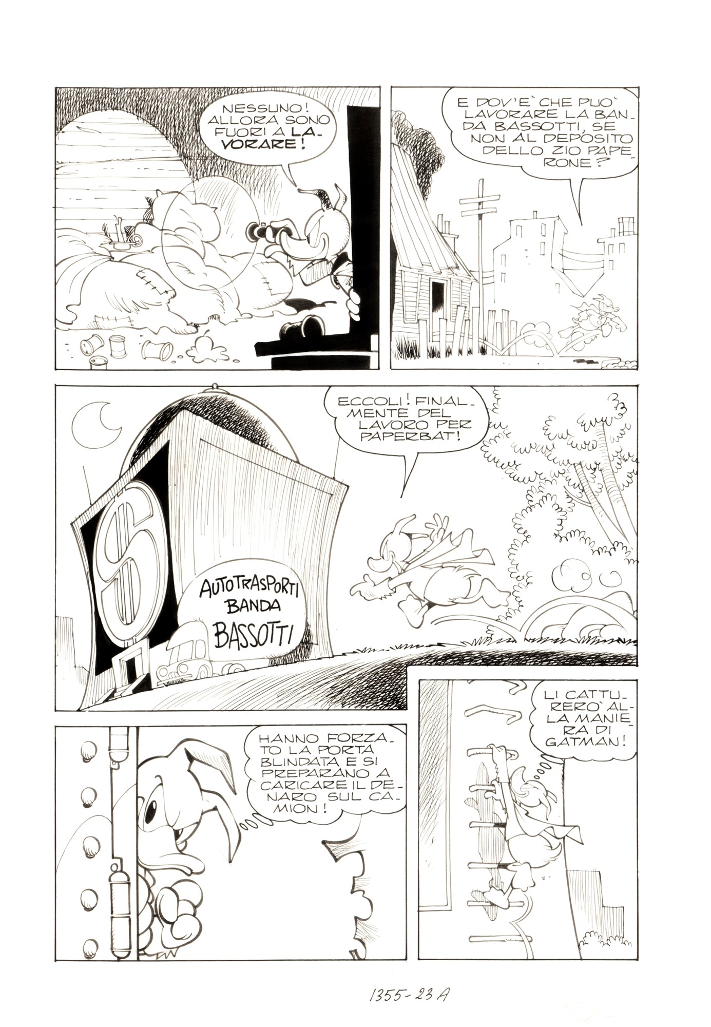 Tavola originale realizzata da Cavazzano per "Paperino aspirante supereroe", edita su Topolino n. 1355 a pag. 21 nel Novembre 1981. Paperino, dopo aver letto alcuni fumetti dei nipotini, decide di assumere l'identità di PaperBat e combattere il crimine, l'idea fu del grande Carlo Chendi che la propose per la prima volta nel 1965, ben prima della nascita di Paperinik, ma per alcune somiglianze con una storia di Barks l'allora direttore di Topolino Mario Gentilini decise di scartarla. Solo nel 1981 con l'arrivo del nuovo direttore finalmente questa avventura vide la luce, PaperBat sarebbe stato a tutti gli effetti il primo vero supereroe Disney. Tra le più iconiche avventure di Paperino.