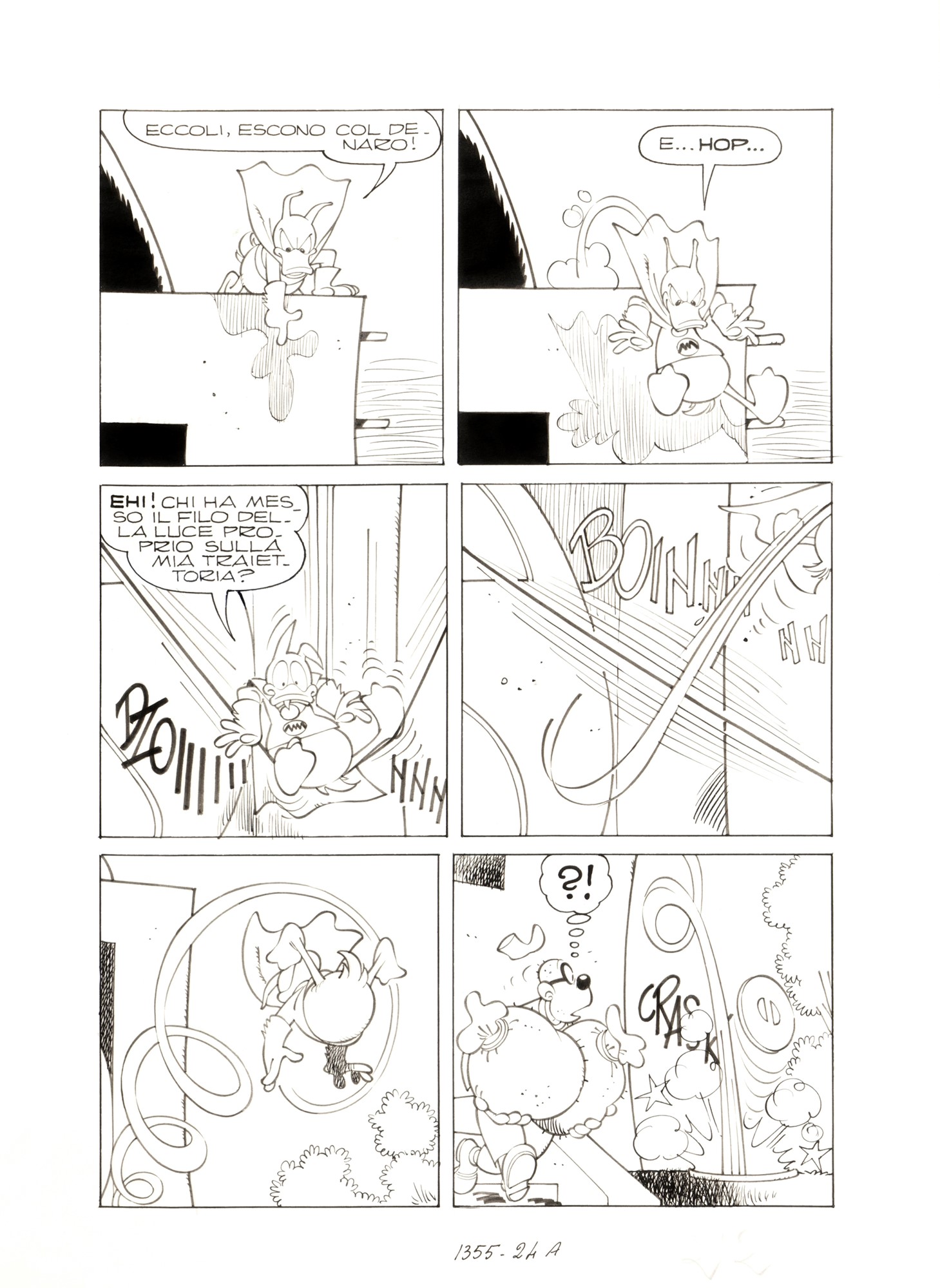 Tavola originale realizzata da Cavazzano per "Paperino aspirante supereroe", edita su Topolino n. 1355 a pag. 22 nel Novembre 1981. Paperino, dopo aver letto alcuni fumetti dei nipotini, decide di assumere l'identità di PaperBat e combattere il crimine, l'idea fu del grande Carlo Chendi che la propose per la prima volta nel 1965, ben prima della nascita di Paperinik, ma per alcune somiglianze con una storia di Barks l'allora direttore di Topolino Mario Gentilini decise di scartarla. Solo nel 1981 con l'arrivo del nuovo direttore finalmente questa avventura vide la luce, PaperBat sarebbe stato a tutti gli effetti il primo vero supereroe Disney. Tra le più iconiche avventure di Paperino.